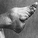 ¿Podían andar esas mujeres con los pies deformados? Las fotos demuestran que no y que de hacerlo sería a pasitos cortos, sin sufrir dolores porque en el proceso de deformidad sufrían una denervación por compresión, es decir, la presión continua del vendaje comprimía los nervios del pie, que se afectaban y perdían su función de recoger la sensibilidad del pie, siendo un pie “anestésico“, que no siente nada. Además, padecían dolores de espalda, porque cuando no se tiene un buen apoyo por deformidades o incorrecciones de los miembros inferiores (piernas y pies) el peso del cuerpo no se reparte por igual entre ambos y el eje de equilibrio del cuerpo se halla desviado, con lo que para compensar, la columna se desvía y deforma.