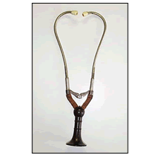 Sé que entre mis lectores encontraría algún voluntario para tan encomiable labor, pero nuestro pobre Laennec sufría horrores al acercar su cabeza al pecho de alguna doncella, amén de las dificultades que encontraba al intentar enterarse de algo en pacientes obesos, donde el sonido quedaba mitigado. Para vencer su pudor, en 1816 ideó un largo tubo de madera de unos 30 cm que apoyaba en el pecho de sus pacientes tal como se ve en la siguiente imagen: